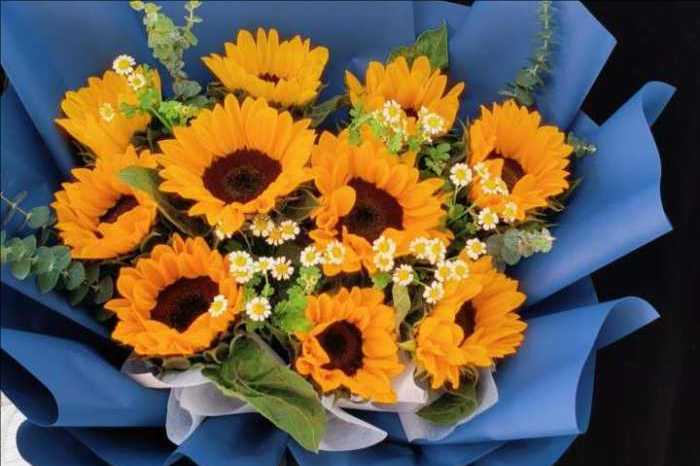 向日葵和洋甘菊都代表着光明,象征着顽强不屈的精神。向日葵的花束形状像一个小太阳,金黄色的花瓣给人一种美好、乐观的感觉,传达了乐观开朗、奋勇直前、不畏艰难的生活态度